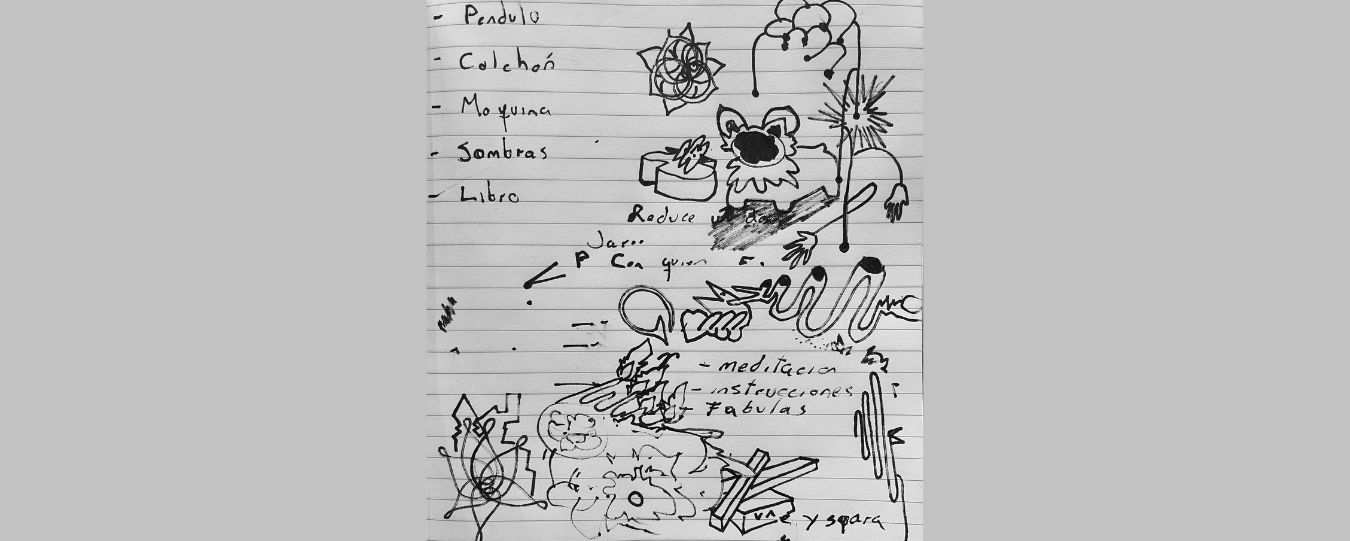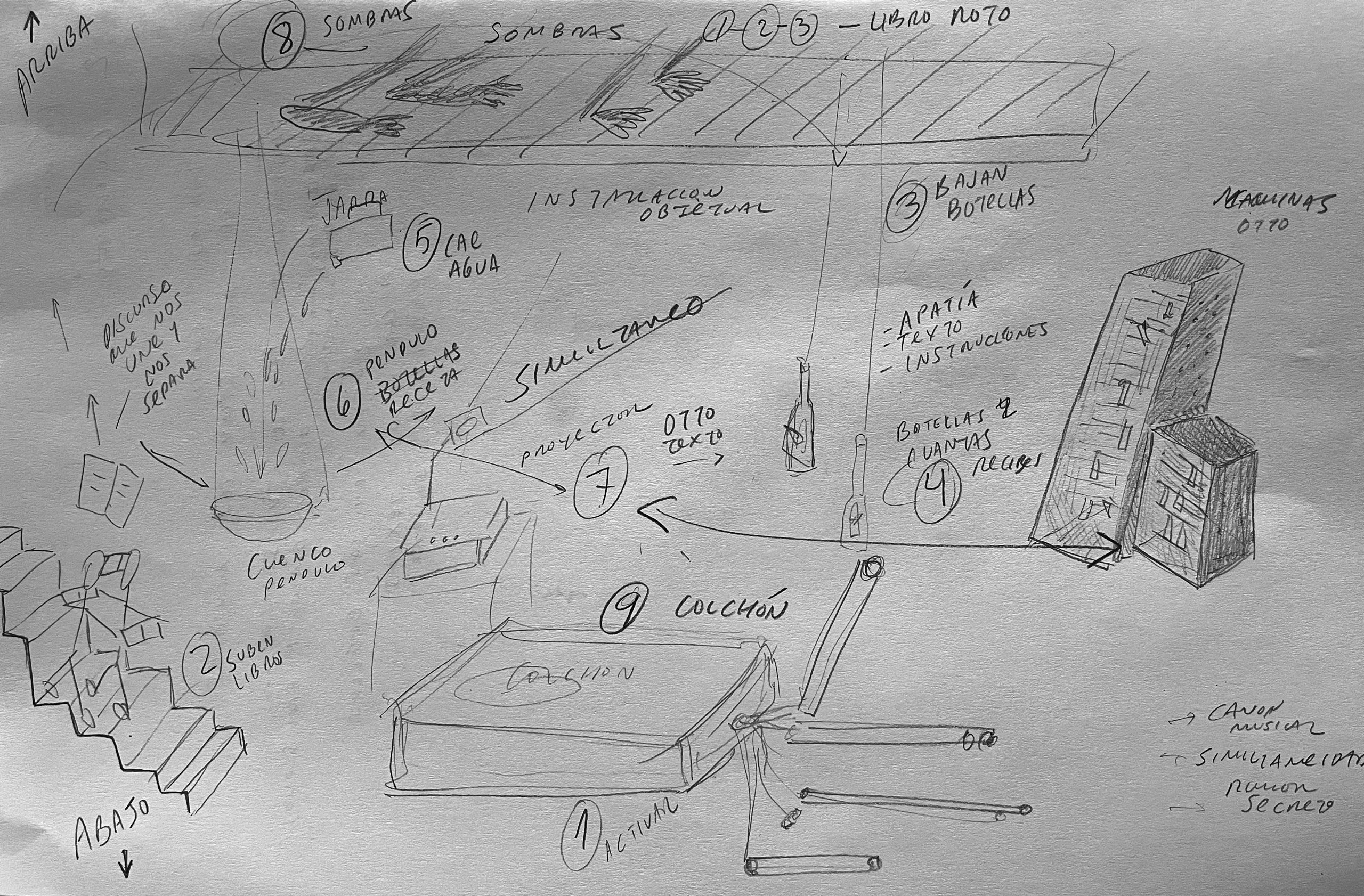Cuatro individualidades coalescen en espiral alrededor de un colchón de aire con tubos de órgano; una máquina de cartón con los vocablos de una lengua del alma; mensajes inflamables que suben y bajan –como es arriba es abajo–; recipientes; péndulos; sombras; reflexiones y proyecciones. Y en el centro de la espiral –como saben los que se ven envueltos en un remolino: hay que dejarse engullir para después ser expulsados– un «secreto» o cámara que resguarda el pneuma «esa luz mágica y sobrenatural sobre la oscuridad natural de las cosas».