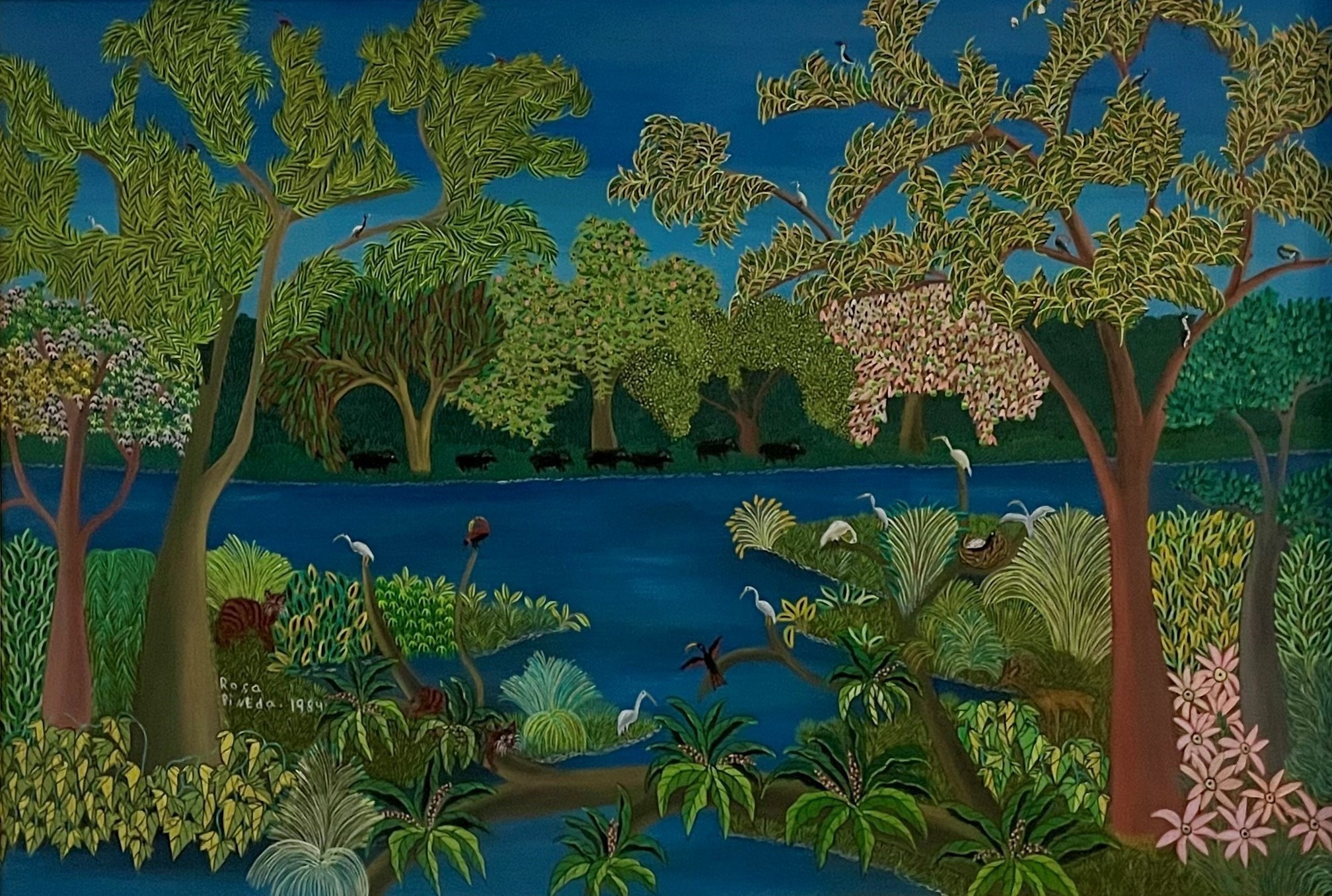Luis González Robles, comisario de exposiciones del Instituto de Cultura Hispánica entre 1949 y 1984, fue pionero en la presentación en Madrid de la pintura primitivista americana con una exposición en el Museo de América en 1968, en un momento en que estas manifestaciones artísticas apenas se conocían y no tenían presencia ni en las galerías ni en los museos, su labor resultó decisiva para visibilizar este movimiento que defendió y promovió hasta su jubilación con varias muestras. Gracias a su iniciativa por educar al público en otros movimientos artísticos emergentes fuera de nuestro país tenemos un conjunto de obras que representan lo más destacado del arte naif latinoamericano del siglo XX. La autora de esta pintura, Rosa Pineda, forma parte de la escuela primitivista fundada en los años sesenta por el poeta nicaragüense Ernesto Cardenal (1925–2020) en un lugar entonces prácticamente desconocido: el archipiélago de Solentiname. Este conjunto de 36 islas volcánicas, situado en el extremo sureste del Gran Lago de Nicaragua —un vasto cuerpo de agua donde nadan tiburones de agua dulce y peces sierra, y donde el bosque tropical crece entre iguanas y venados— se convirtió en un centro artístico singular. Allí nació un movimiento pictórico basado en la observación del entorno, la vida comunitaria y una sensibilidad profundamente poética. Zainos en la otra orilla ejemplifica esa mirada: una naturaleza exuberante, colores vivos y una escena cotidiana elevada a visión íntima y casi idealizada, donde cada detalle invita a una lectura pausada. Durante los años ochenta, Nicaragua vivió el florecimiento del arte primitivista, la poesía de taller y diversas expresiones culturales antes reservadas a la élite intelectual. Pintores y poetas alcanzaron entonces una proyección nacional e internacional sin precedentes, participando en bienales, certámenes y exposiciones que llevaron esta estética a América y Europa. Rosa Pineda integró también exposiciones dedicadas a visibilizar el papel de la mujer artista en Nicaragua, junto a creadoras como Yelba Ubau, Hilda Vogl, Celia Lacayo, Patricia Belli o María Gallo, contribuyendo a ampliar el lenguaje visual desde una sensibilidad íntima, diversa y plenamente contemporánea. La obra estuvo depositada en el Museo de América desde noviembre de 1993 hasta febrero de 2010, fecha en la que regresó a la Agencia. Para más información consultar el catálogo: Blanco Conde, Mª. (2016). Catálogo de la colección artística de la Agencia. AECID. Disponible en línea. Portada de uno de los catálogos de la exposición primitivos actuales de América que también itineró por las Islas Canarias.