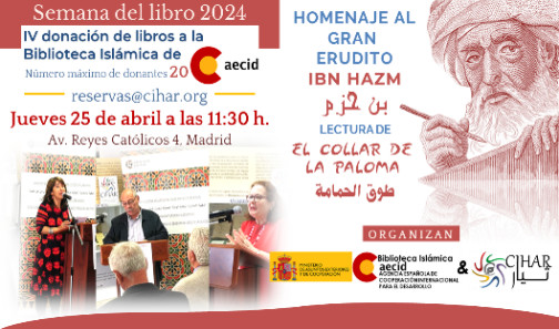 El jueves 25 de abril será la lectura de El collar de la Paloma, del andalusí Ibn Hazm, con la participación del músico Eduardo Paniagua. Colabora el Círculo Intercultural Hispano Árabe (CIHAR), que donará libros.